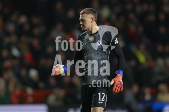 2867168 Filip Jorgensen, do Chelsea, comemora um gol marcado por Jorrel Hato, tambem do Chelsea, durante a partida da FA Cup entre Charlton Athletic e Chelsea no The Valley, em Londres, Inglaterra (Foto de Alexander Canillas/Sports Press Photo).