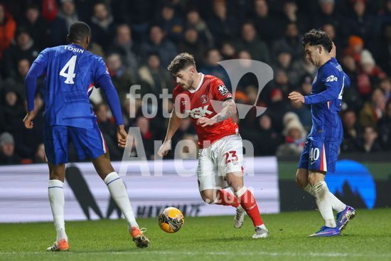 2867186 Charlie Kelman, do Charlton Athletic, sofre pressao de Tosin Adarabioyo e Facundo Buonanotte, ambos do Chelsea, durante a partida da FA Cup entre Charlton Athletic e Chelsea no The Valley, em Londres, Inglaterra (Foto de Alexander Canillas/Sports Press Photo).