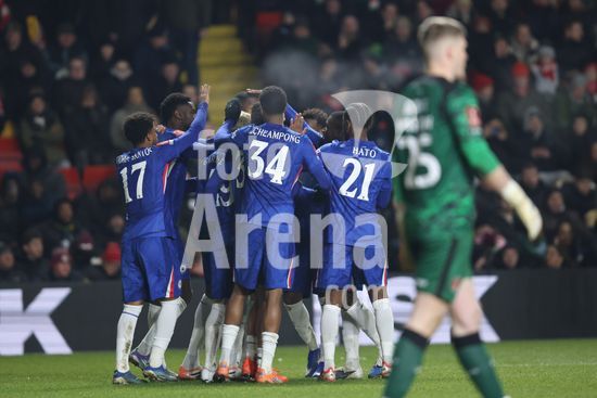 2867185 Jogadores do Chelsea comemoram um gol marcado por Jorrel Hato durante a partida da FA Cup entre Charlton Athletic e Chelsea no The Valley, em Londres, Inglaterra (Foto de Alexander Canillas/Sports Press Photo).