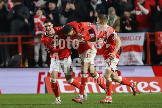 2867189 Lloyd Jones e Greg Docherty, do Charlton Athletic, comemoram com Miles Leaburn, tambem do Charlton Athletic, apos marcarem um gol durante a partida da FA Cup entre Charlton Athletic e Chelsea, no The Valley, em Londres, Inglaterra (Foto de Alexander Canillas/Sports Press Photo).