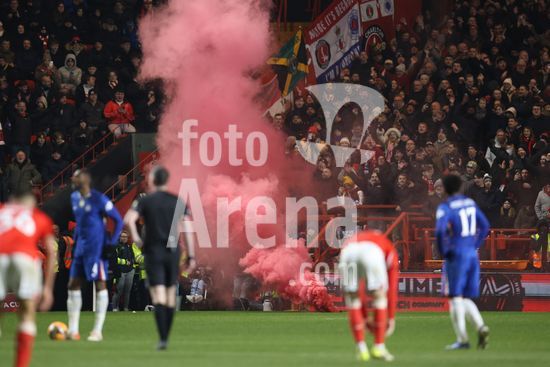 2867190 Uma bomba de fumaca foi lancada no campo, fazendo com que o arbitro interrompesse a partida durante o jogo da FA Cup entre Charlton Athletic e Chelsea no The Valley, em Londres, Inglaterra (Foto de Alexander Canillas/Sports Press Photo).