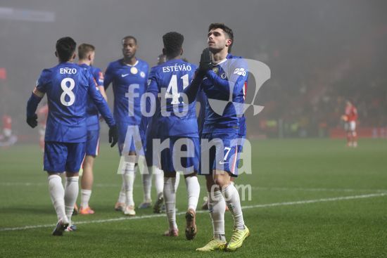 2867196 Jogadores do Chelsea comemoram um gol marcado por Pedro Neto durante a partida da FA Cup entre Charlton Athletic e Chelsea no The Valley, em Londres, Inglaterra (Foto de Alexander Canillas/Sports Press Photo).