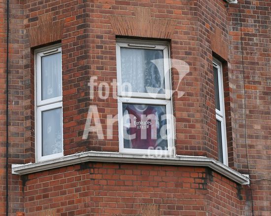 2916719 LONDRES, INGLATERRA - 1 DE ABRIL: Produtos do Arsenal pendurados nas janelas de apartamentos vizinhos antes da partida de volta das quartas de final da Liga dos Campeoes Feminina da UEFA 2025/26 entre Chelsea e Arsenal, no Stamford Bridge, em 1 de abril de 2026, em Londres, Inglaterra. (Jay Patel/SPP)