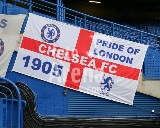 2916736 LONDRES, INGLATERRA - 1 DE ABRIL: Vista geral das bandeiras do Chelsea hasteadas no estadio antes da partida de volta das quartas de final da Liga dos Campeoes Feminina da UEFA 2025/26 entre Chelsea e Arsenal, no Stamford Bridge, em 1 de abril de 2026, em Londres, Inglaterra. (Jay Patel/SPP)