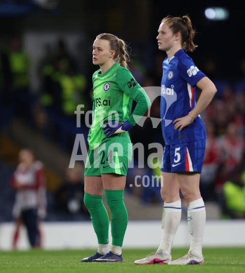 2916909 LONDRES, INGLATERRA, 1 DE ABRIL: Hannah Hampton, do Chelsea Women, demonstra decepcao e desanimo durante a partida entre Chelsea Women FC e Arsenal Women FC, valida pela Liga dos Campeoes Feminina da UEFA, no Estadio Stamford Bridge, em Londres, Inglaterra, no dia 1 de abril. (Foto de Daniel Weir) (Daniel Weir/Sports Press Photo / SPP)