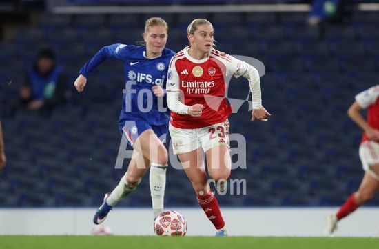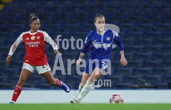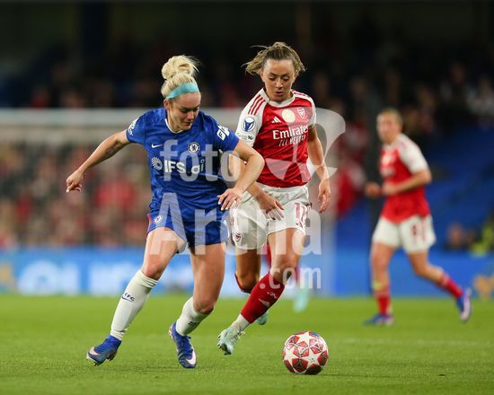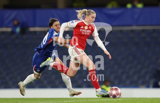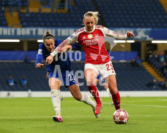 2916723 LONDRES, INGLATERRA - 1 DE ABRIL: Lucy Bronze, do Chelsea, e perseguida por Stina Blackstenius, do Arsenal, durante a partida de volta das quartas de final da Liga dos Campeoes Feminina da UEFA 2025/26 entre Chelsea e Arsenal, no Stamford Bridge, em 1 de abril de 2026, em Londres, Inglaterra. (Jay Patel/SPP)