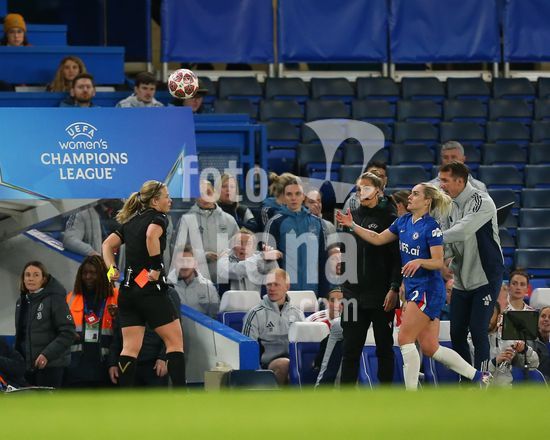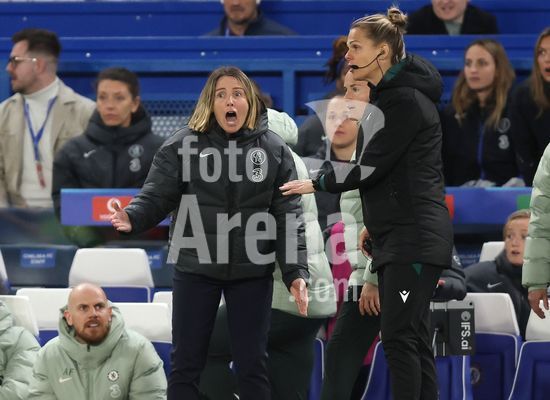 2916919 LONDRES, INGLATERRA, 1 DE ABRIL: Sonia Bompastor, treinadora do Chelsea Women, demonstra frustracao com a arbitra durante a partida entre Chelsea Women FC e Arsenal Women FC, valida pela Liga dos Campeoes Feminina da UEFA, no Estadio Stamford Bridge, em Londres, Inglaterra, em 1º de abril. (Foto de Daniel Weir) (Daniel Weir/Sports Press Photo / SPP)