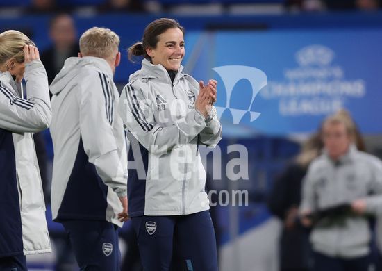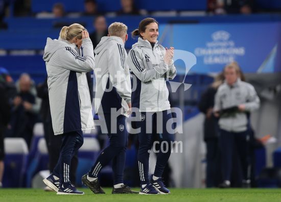 2916927 LONDRES, INGLATERRA, 1 DE ABRIL: Renee Slegers, treinadora do Arsenal Women, demonstra alegria ao comemorar o apito final durante a partida entre Chelsea Women FC e Arsenal Women FC, valida pela Liga dos Campeoes Feminina da UEFA, no Estadio Stamford Bridge, em Londres, Inglaterra, em 1º de abril. (Foto de Daniel Weir) (Daniel Weir/Sports Press Photo / SPP)