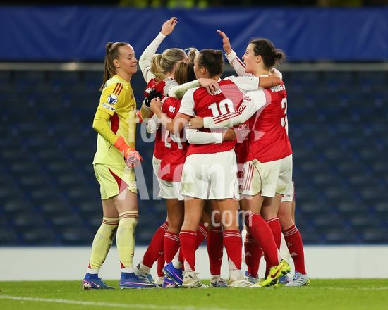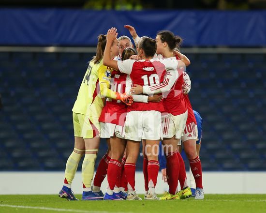 2917017 LONDRES, INGLATERRA - 1 DE ABRIL: Jogadoras do Arsenal comemoram em circulo apos o apito final da partida de volta das quartas de final da Liga dos Campeoes Feminina da UEFA 2025/26 entre Chelsea e Arsenal, no Stamford Bridge, em 1 de abril de 2026, em Londres, Inglaterra. (Jay Patel/SPP)