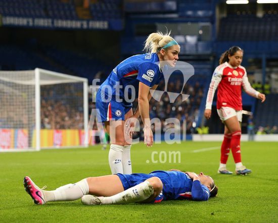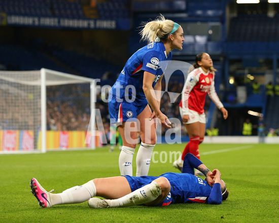 2916971 LONDRES, INGLATERRA - 1 DE ABRIL: Lucy Bronze, do Chelsea (no chao), cai com dores durante a partida de volta das quartas de final da Liga dos Campeoes Feminina da UEFA 2025/26 entre Chelsea e Arsenal, no Stamford Bridge, em 1 de abril de 2026, em Londres, Inglaterra. (Jay Patel/SPP)