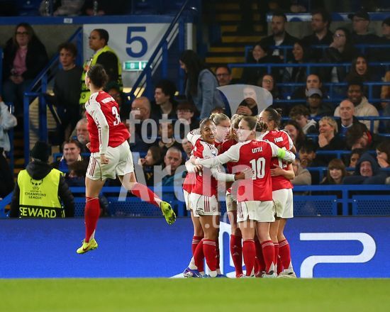 2917003 LONDRES, INGLATERRA - 1 DE ABRIL: Lotte Wubben-Moy, do Arsenal (a esquerda), salta para comemorar o gol marcado por Stina Blackstenius, tambem do Arsenal, que posteriormente foi anulado pelo VAR por impedimento, durante a partida de volta das quartas de final da Liga dos Campeoes Feminina da UEFA 2025/26 entre Chelsea e Arsenal, no Stamford Bridge, em 1º de abril de 2026, em Londres, Inglaterra. (Jay Patel/SPP)