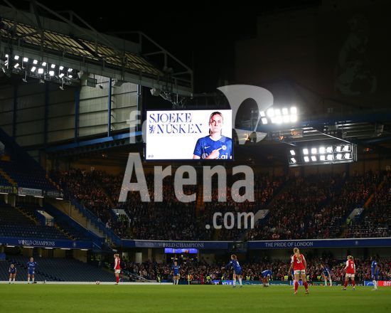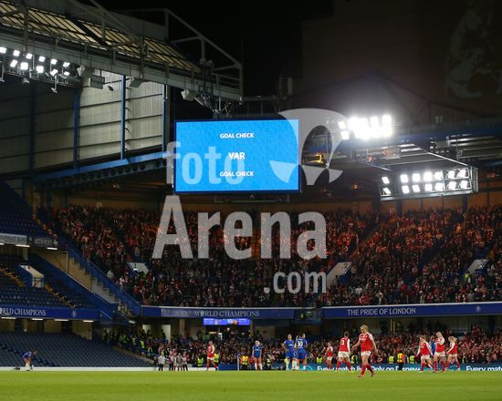 2917006 LONDRES, INGLATERRA - 1 DE ABRIL: Revisao em andamento do VAR exibida no telao para o gol marcado por Stina Blackstenius, do Arsenal, que foi anulado por impedimento durante a partida de volta das quartas de final da Liga dos Campeoes Feminina da UEFA 2025/26 entre Chelsea e Arsenal, no Stamford Bridge, em 1º de abril de 2026, em Londres, Inglaterra. (Jay Patel/SPP)