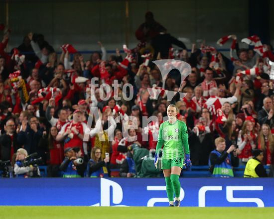 2917014 LONDRES, INGLATERRA - 1 DE ABRIL: A goleira Hannah Hampton, do Chelsea, em frente a arquibancada lotada destinada a torcida visitante do Arsenal, durante a partida de volta das quartas de final da Liga dos Campeoes Feminina da UEFA 2025/26 entre Chelsea e Arsenal, no Stamford Bridge, em 1º de abril de 2026, em Londres, Inglaterra. (Jay Patel/SPP)