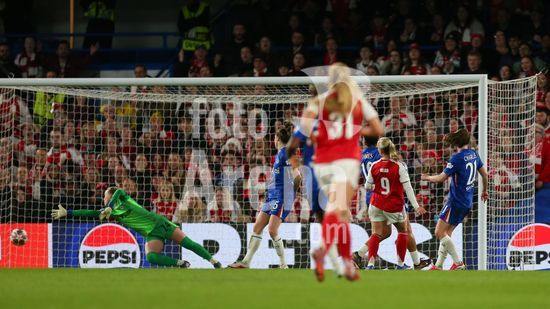 2917008 LONDRES, INGLATERRA - 1 DE ABRIL: Beth Mead, do Arsenal, chuta a bola por cima da goleira Hannah Hampton, do Chelsea, e ela acerta a trave durante a partida de volta das quartas de final da Liga dos Campeoes Feminina da UEFA 2025/26 entre Chelsea e Arsenal, no Stamford Bridge, em 1º de abril de 2026, em Londres, Inglaterra. (Jay Patel/SPP)