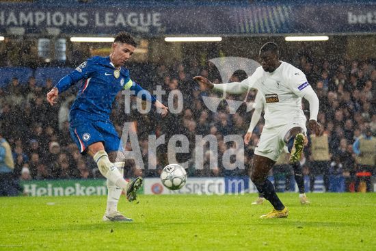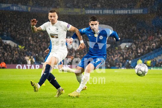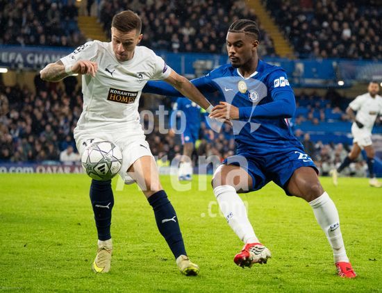 2871603 Mislav Orsic (E) protegendo a bola de Jorrel Hato (D) durante a partida da Liga dos Campeoes da UEFA entre Chelsea e Pafos no Stamford Bridge em Londres, Reino Unido (Foto de Elliot Legg/Sports Press Photo) (Elliot Legg/Sports Press Photo / SPP)