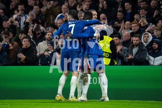 2871620 Jogadores do Chelsea comemorando o gol de abertura de Moises Caicedo durante a partida da Liga dos Campeoes da UEFA entre Chelsea e Pafos, no Stamford Bridge, em Londres, Reino Unido (Foto de Elliot Legg/Sports Press Photo) (Elliot Legg/Sports Press Photo / SPP)