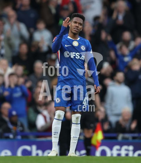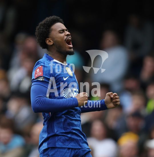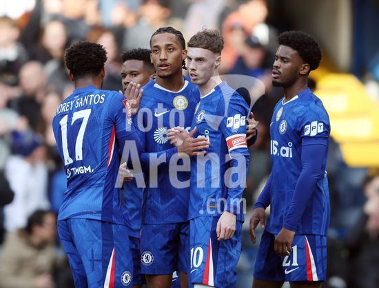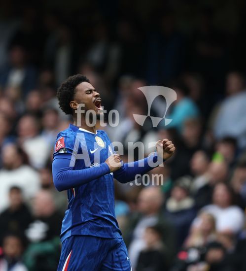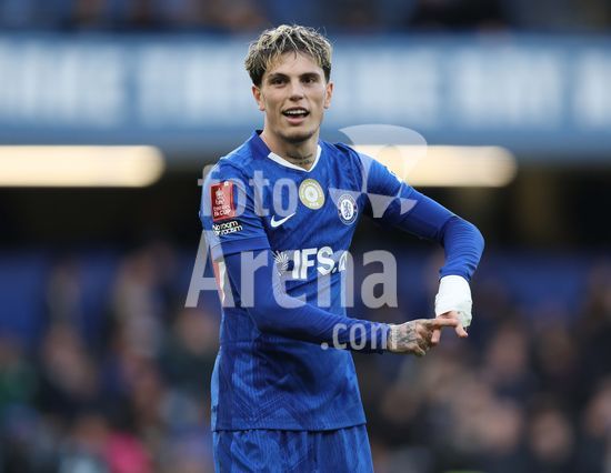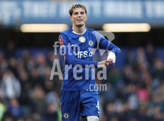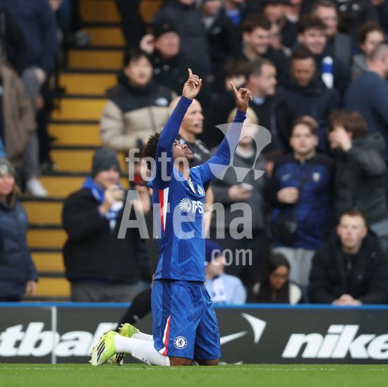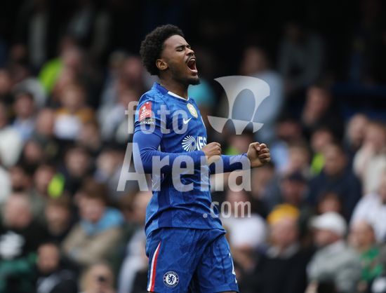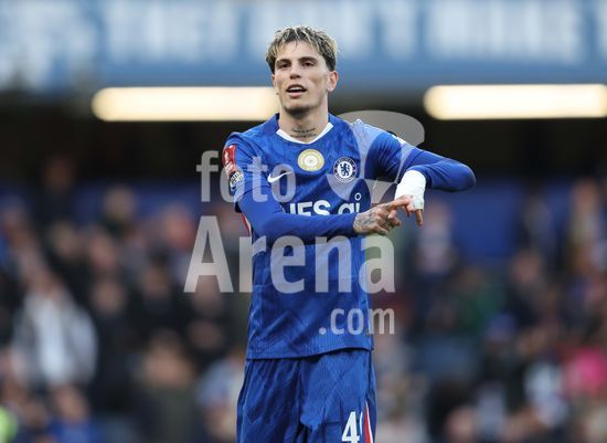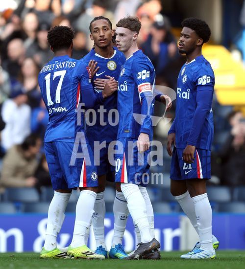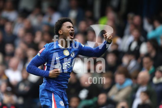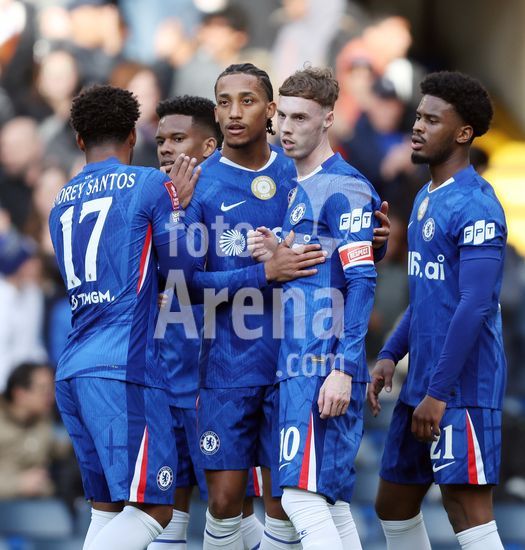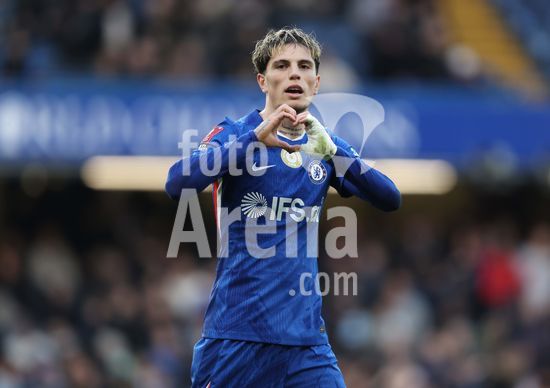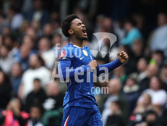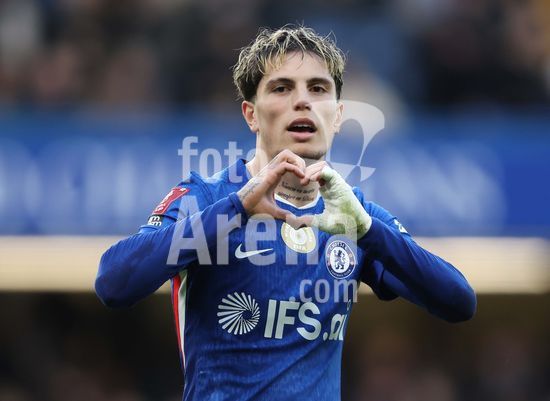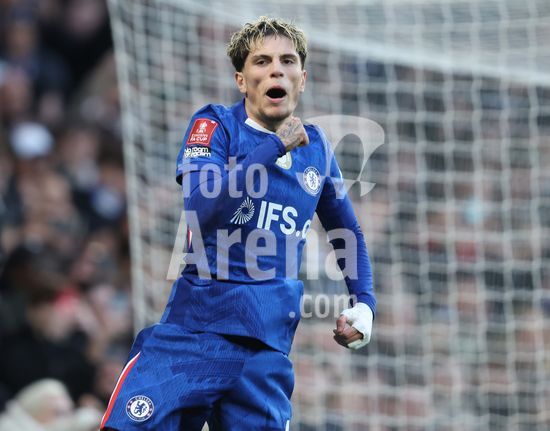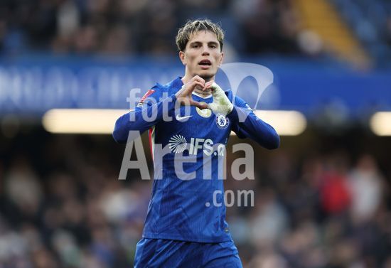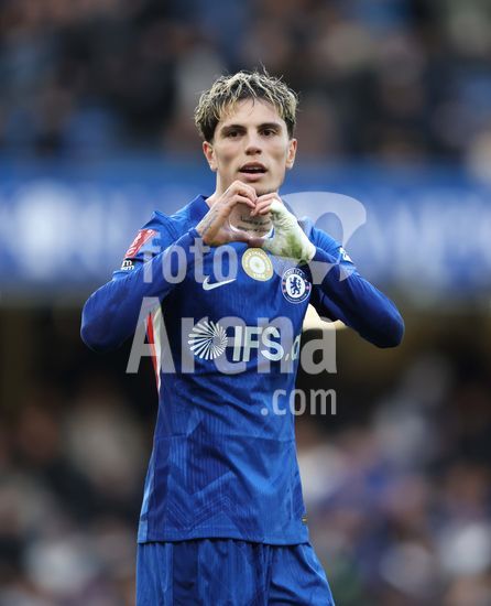 LONDRES, INGLATERRA, 4 DE ABRIL: GOL 7-0, Alejandro Garnacho, do Chelsea, comemora apos marcar um penalti e colocar o Chelsea em vantagem de 7-0 durante a partida entre Chelsea FC e Port Vale FC, valida pelas quartas de final da Copa da Inglaterra (Emirates FA Cup), no Estadio Stamford Bridge, em Londres, Inglaterra, em 4 de abril. (Daniel Weir/Sports Press Photo / SPP)
