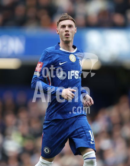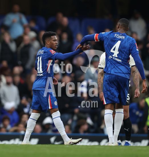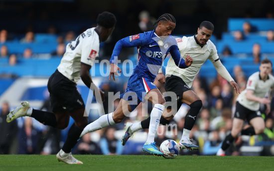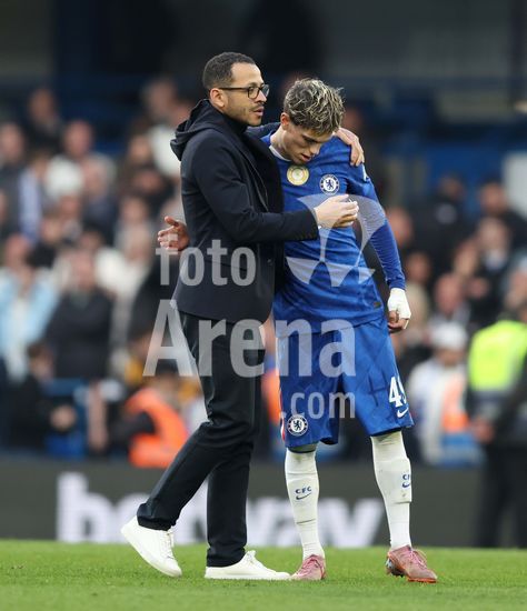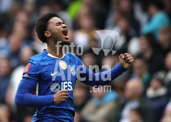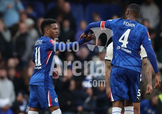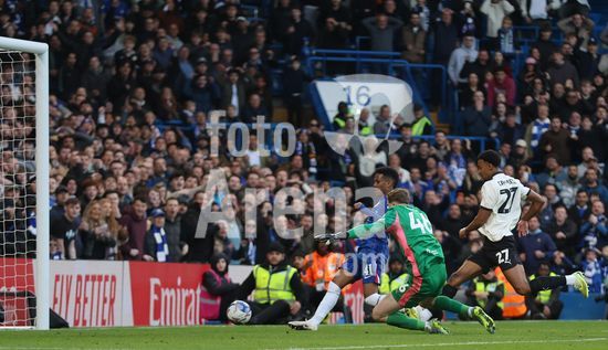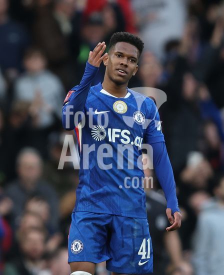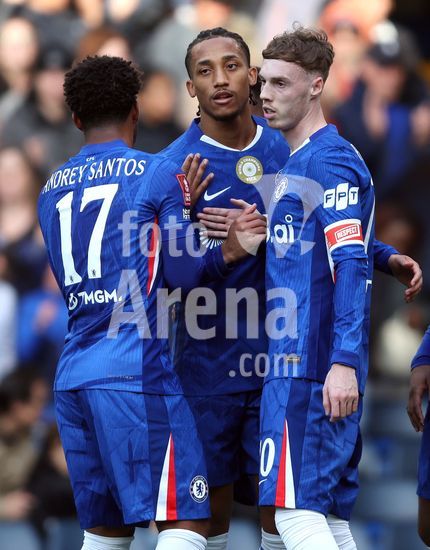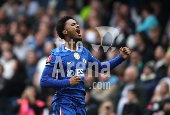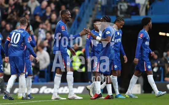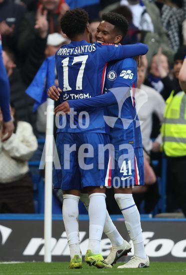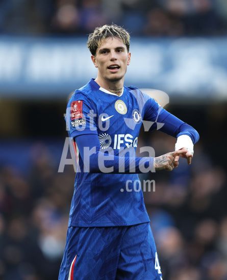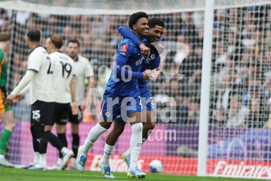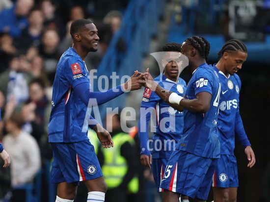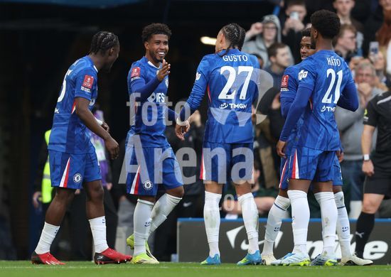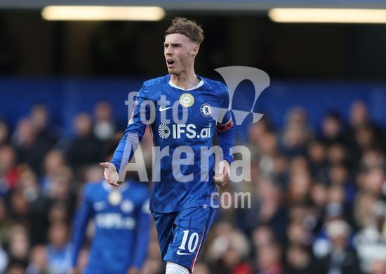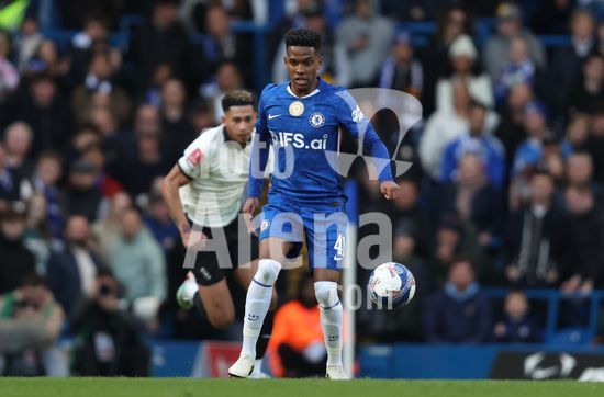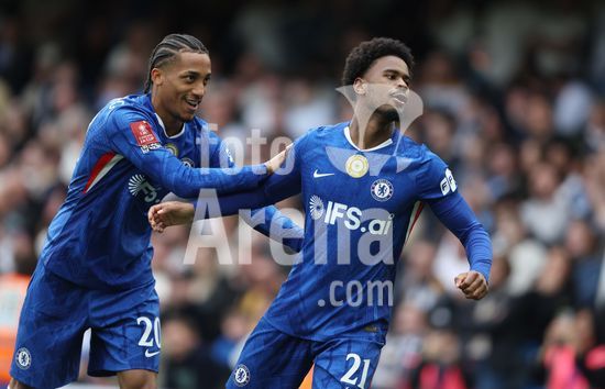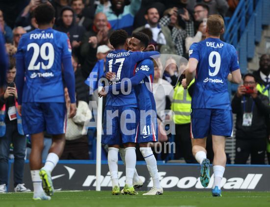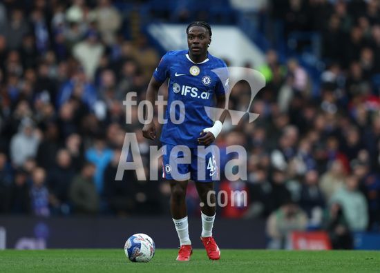 LONDRES, INGLATERRA, 4 DE ABRIL: GOL 7-0, Alejandro Garnacho, do Chelsea, comemora apos marcar um penalti e colocar o Chelsea em vantagem de 7-0 durante a partida entre Chelsea FC e Port Vale FC, valida pelas quartas de final da Copa da Inglaterra (Emirates FA Cup), no Estadio Stamford Bridge, em Londres, Inglaterra, em 4 de abril. (Daniel Weir/Sports Press Photo / SPP)