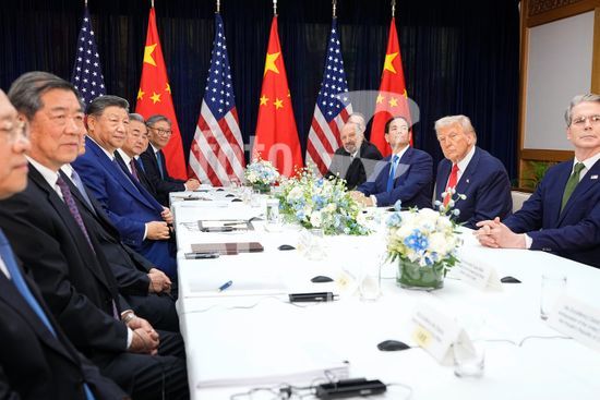 ny301025100112 Xi Jinping, ChinaÕs top leader, third from left, sits across the table from President Donald Trump as they meet in Busan, South Korea, on Thursday, Oct. 30, 2025. The two leaders reached an agreement on fentanyl, some tariffs and rare earths, at least for a year. But even as the global trade picture cleared a little, Trump spurred new worries about nuclear proliferation. (Haiyun Jiang/The New York Times/Fotoarena)