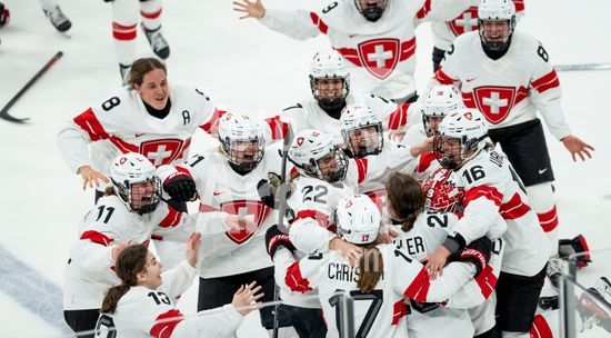 ny190226135111 Teammates swarm Alina Muller of Switzerland (25) after she scored the winning goal in overtime of the bronze medal women?s hockey match against Sweden during the 2026 Milan Cortina Winter Olympics at Santagiulia Arena in Milan, on Thursday, Feb. 19, 2026. (Doug Mills/The New York Times/Fotoarena)