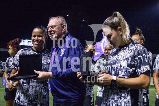 2918058 Gabi Zanotti e Victoria Albuquerque recebem homenagens pelos seus 258 jogos com a camisa do Corinthians por Osmar Stabille e Iris Sesso antes da partida entre Corinthians X Red Bull Bragantino, válida pela sexta rodada do Campeonato Brasileiro Feminino Série A1 2026, nessa noite de sexta-feira, realizada no Estádio Alfredo Schurig, no Parque São Jorge, em São Paulo, SP.