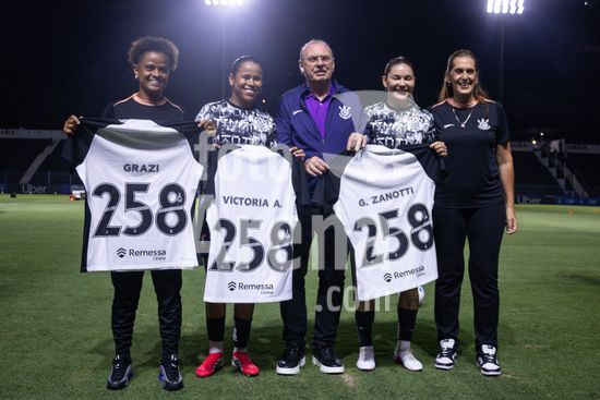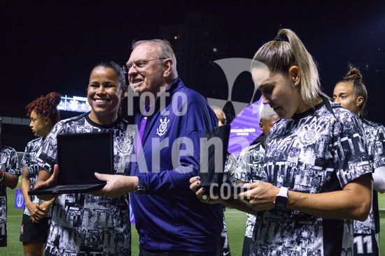 2918057 Gabi Zanotti e Victoria Albuquerque recebem homenagens pelos seus 258 jogos com a camisa do Corinthians por Osmar Stabille e Iris Sesso antes da partida entre Corinthians X Red Bull Bragantino, válida pela sexta rodada do Campeonato Brasileiro Feminino Série A1 2026, nessa noite de sexta-feira, realizada no Estádio Alfredo Schurig, no Parque São Jorge, em São Paulo, SP.