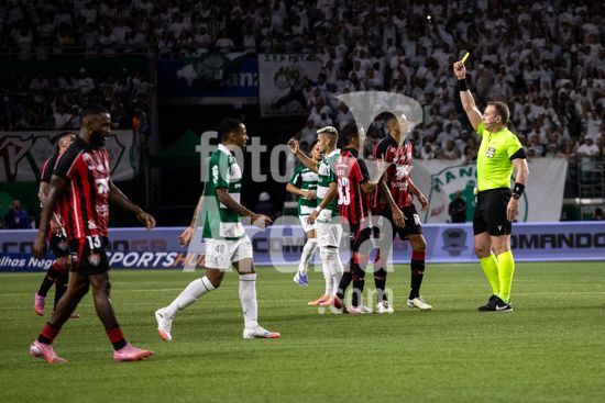 2845304 Árbitro Lucas Paulo Torezin dá cartão amarelo a Erick (Vitória) durante a partida entre Palmeiras e Vitória, válida pela 37ª rodada antecipada do Brasileirão e realizada na noite desta quarta-feira (19) no Allianz Parque, em São Paulo, SP.