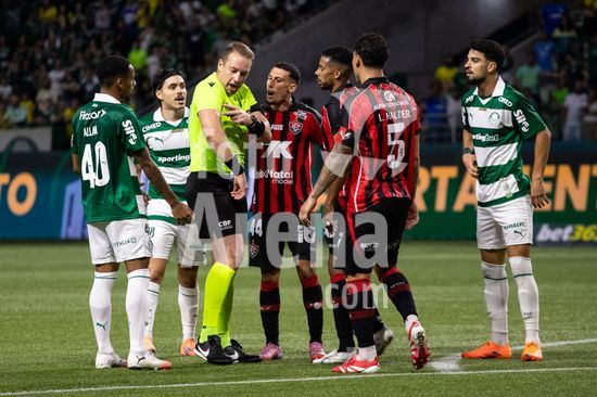 2845306 Árbitro Lucas Paulo Torezin conversa com jogadores durante a partida entre Palmeiras e Vitória, válida pela 37ª rodada antecipada do Brasileirão e realizada na noite desta quarta-feira (19) no Allianz Parque, em São Paulo, SP.
