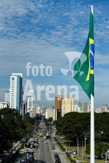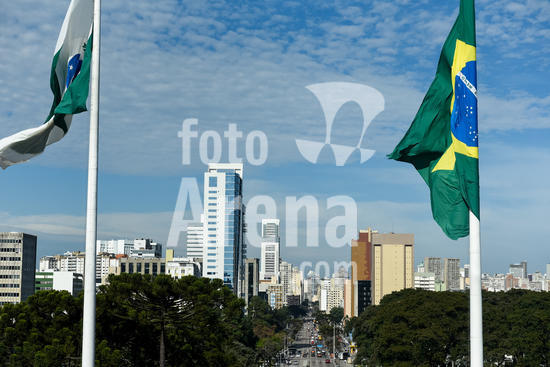 1549024 Vista da cidade de Curitiba, com a bandeira do Brasil e a rua Cândido de Abreu que liga o Centro Cívico - onde está a sede do governo estadual - com o centro da cidade.