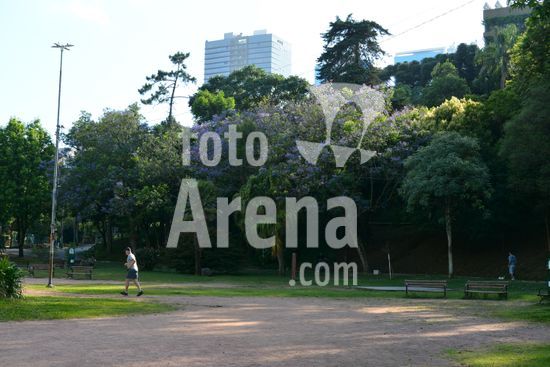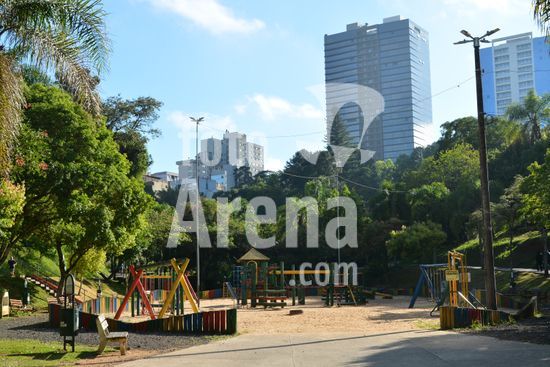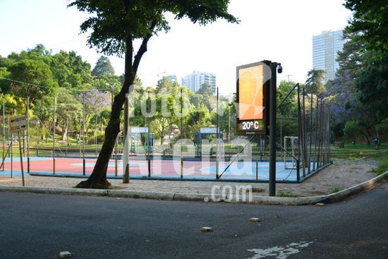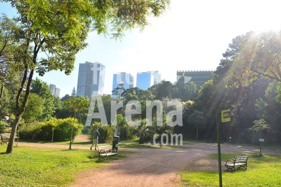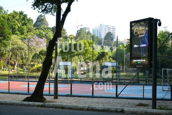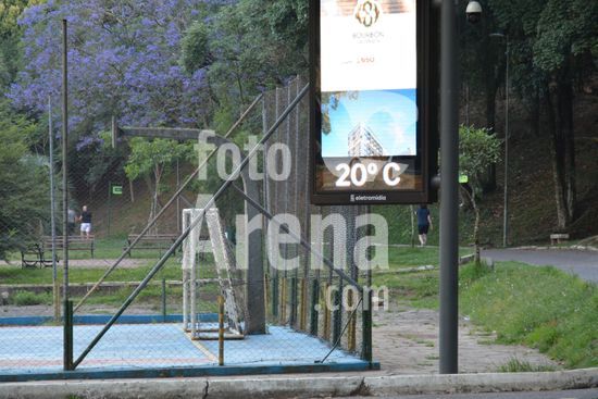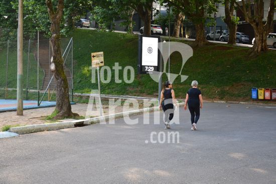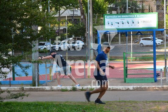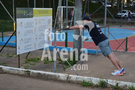 Imagens de clima tempo em Caxias do Sul nesta terça-feira, 2 de dezembro, com céu azul claro, poucas nuvens, previsão de nebulosidade durante o dia, temperatura agradável, em torno de 20 graus, praticamente sem vento. Na imagem homem realiza alongamentos em aparelho localizado em parque público, em frente a um painel com exemplos de exercícios. Caixas do Sul, RS (02).