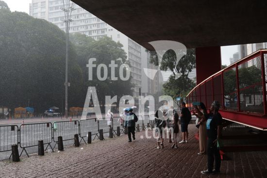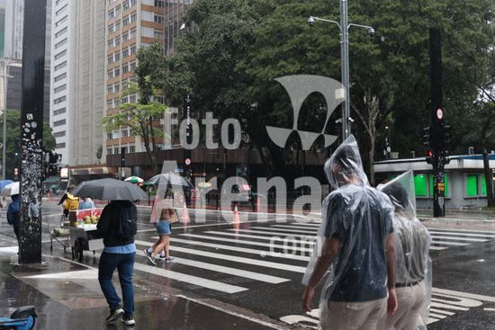 2878184 Chuva forte coloca cidade de SP em estado de atenção para alagamentos neste domingo,(1). A Defesa Civil emite alerta para raios e granizo. Na Avenida Paulista, as imagens mostram a intensidade da chuva.
