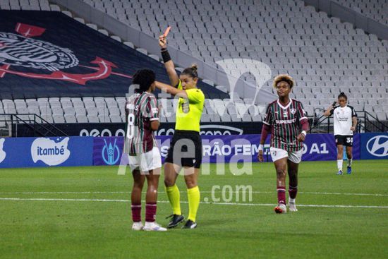 2891645 Árbitra Francielly Fernanda Lima de Castro dá cartão vermelho a Karina (Fluminense) durante a partida entre Corinthians e Fluminense, válida pela 2ª rodada do Brasileirão Feminino, realizada na noite desta sexta-feira (20) na Neo Química Arena em São Paulo, SP.