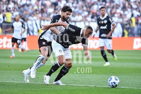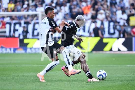 2850969 Marçal do Botafogo (Esquerda) e Yuri Alberto do Corinthians (Direita) disputam a bola, durante partida entre Corinthians x Botafogo, válida pela trigésima sexta rodada do Campeonato Brasileiro de Futebol 2025, neste domingo (30), na Neo Química Arena, SP.