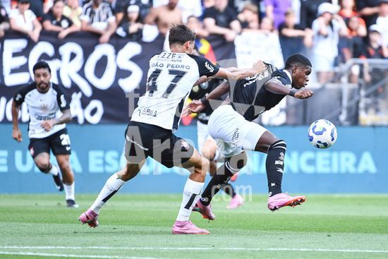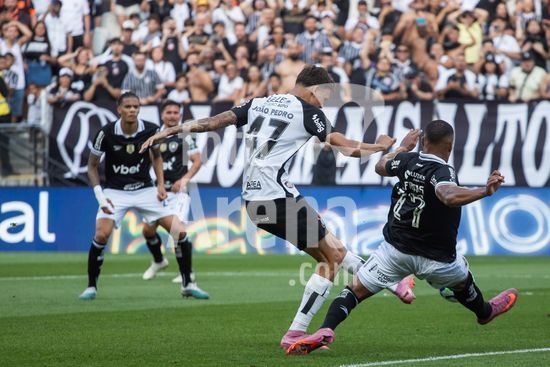 2850940 João Pedro Tchoca (Corinthians) tenta finalização e é bloqueado por Marlon Freitas (Botafogo) durante a partida entre Corinthians e Botafogo, válida pela 36ª rodada do Brasileirão, realizada na tarde deste domingo (30) na Neo Química Arena, em São Paulo, SP.