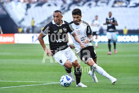 2850928 Cuiabano do Botafogo (Esquerda) e André Carrillo do Corinthians (Direita) disputam a bola, durante partida entre Corinthians x Botafogo, válida pela trigésima sexta rodada do Campeonato Brasileiro de Futebol 2025, neste domingo (30), na Neo Química Arena, SP.