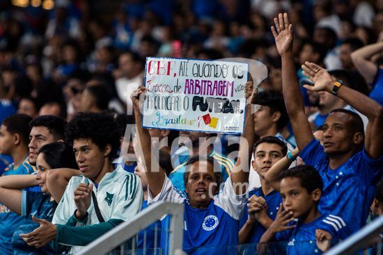 2853546 Jogo entre Cruzeiro x Botafogo, válido pela rodada 37 do campeonato brasileiro de 2025, nesta quinta-feira (04), Mineirão. Na foto, torcedora faz protesto contra a arbritagem e cbf.