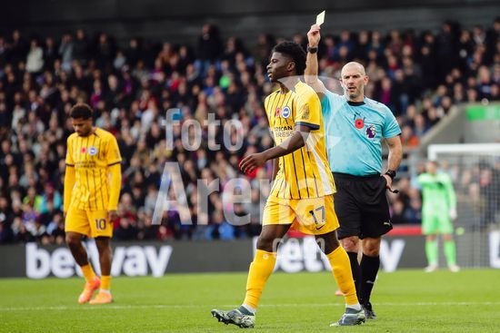 2839209 O arbitro Tim Robinson mostra um cartao amarelo para Carlos Baleba (17 Brighton) durante o jogo da Premier League entre Crystal Palace e Brighton & Hove Albion no Selhurst Park em Londres, Inglaterra. (Liam Asman/SPP)