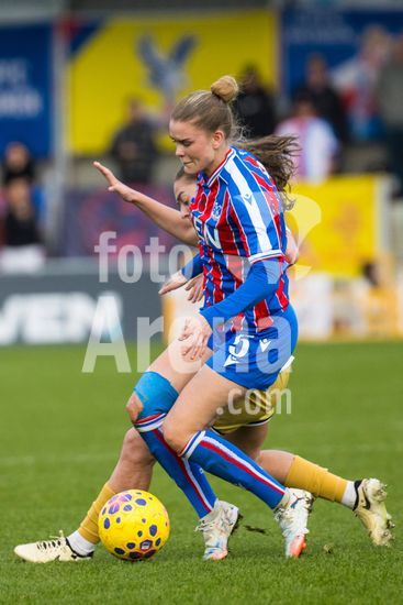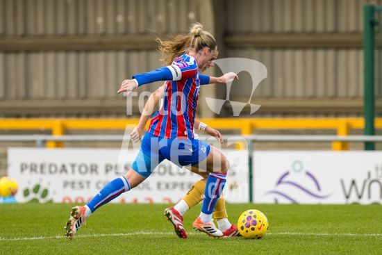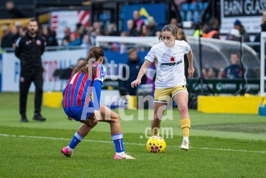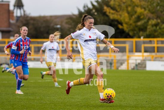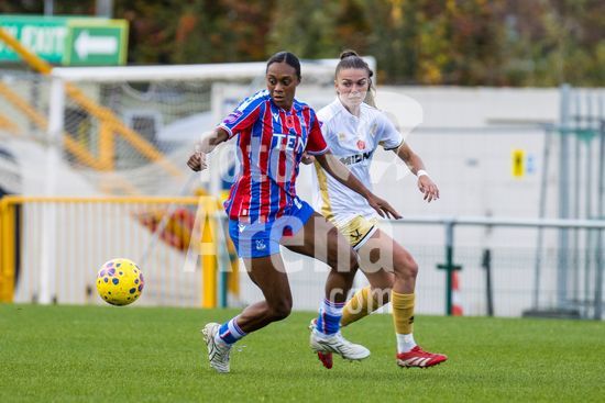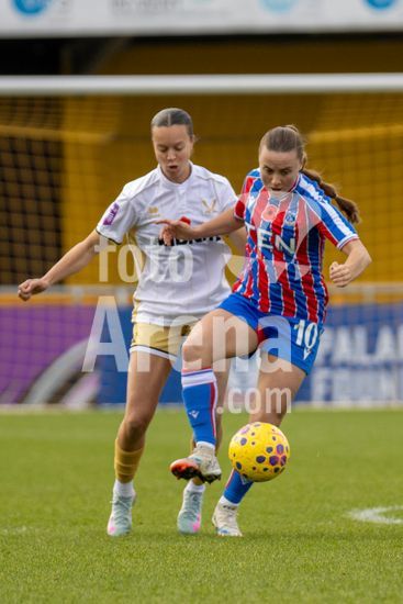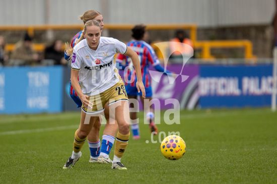 2839138 Kirsty Howat (10 Crystal Palace) segura a bola sob pressao durante a partida entre Crystal Palace e Sheffield United na WSL2 no VBS Community Stadium Sutton, Londres, Inglaterra, no domingo, 9 de novembro de 2025. (Claire Jeffrey / SPP)