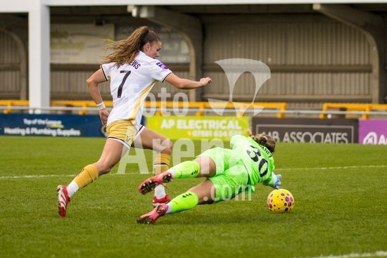 2839098 A goleira Shae Yanez (30 Crystal Palace) nao consegue impedir o chute de Jess Reavill (41 Sheffield United) durante a partida entre Crystal Palace e Sheffield United na WSL2 no VBS Community Stadium Sutton, Londres, Inglaterra, no domingo, 9 de novembro de 2025. (Claire Jeffrey / SPP)