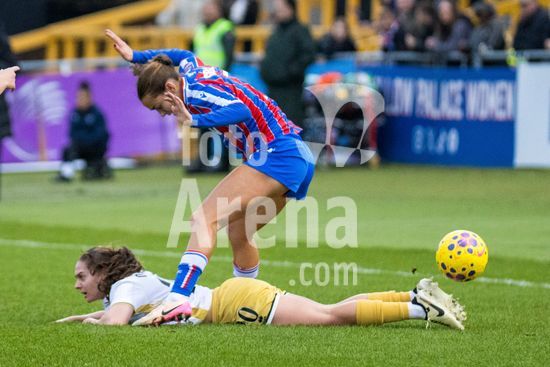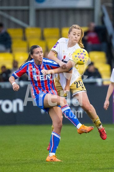 2839099 Allyson Swaby (29 Crystal Palace) intercepta Amy Andrews (7 Sheffield United) durante a partida entre Crystal Palace e Sheffield United na WSL2 no VBS Community Stadium Sutton, Londres, Inglaterra, no domingo, 9 de novembro de 2025. (Claire Jeffrey / SPP)
