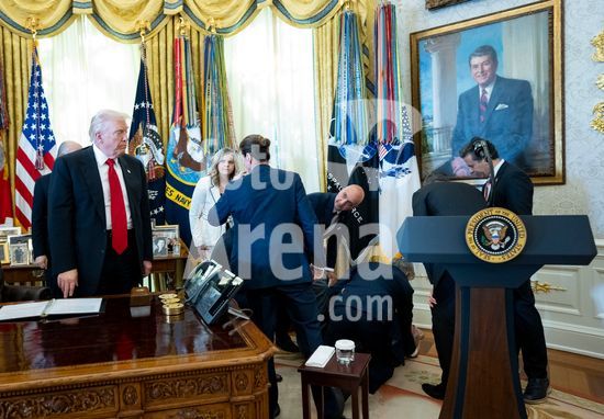 ny061125171312 President Donald Trump, left, looks on after a man collapsed during a press conference about a drug prices deal, in the Oval Office of the White House in Washington, on Thursday, Nov. 6, 2025. (Doug Mills/The New York Times/Fotoarena)