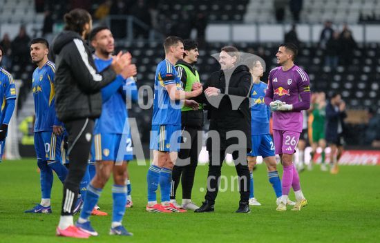 2867362 O tecnico do Leeds United, Daniel Farke, comemora a vitoria com seus jogadores apos o apito final durante a partida da terceira rodada da Copa da Inglaterra (Emirates FA Cup) entre Derby County e Leeds United, no Estadio Pride Park, em Derby. (Paul Bonser/Sports Press Photo / SPP)
