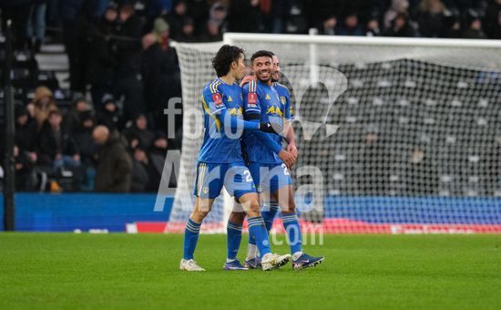 2867365 James Justin, do Leeds United, comemora seu gol aos 90+3 minutos, que garantiu o placar de 1-3 durante a terceira rodada da Copa da Inglaterra (Emirates FA Cup) entre Derby County e Leeds United, no Estadio Pride Park, em Derby. (Paul Bonser/Sports Press Photo / SPP)
