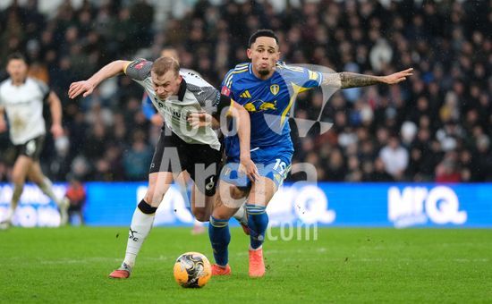 2867349 Sondre Langas, do Derby County, sob pressao de Joel Piroe, do Leeds United, durante a partida da terceira rodada da Copa da Inglaterra (Emirates FA Cup) entre Derby County e Leeds United, no Estadio Pride Park, em Derby. (Paul Bonser/Sports Press Photo / SPP)
