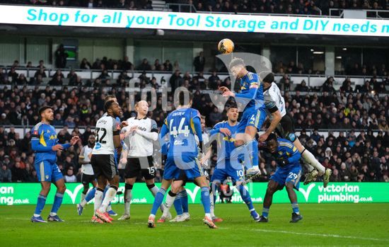 2867371 Ebou Adams, do Derby County, ganha a disputa de cabeca contra Brenden Aaronson, do Leeds United, durante a partida da terceira rodada da Copa da Inglaterra (Emirates FA Cup) entre Derby County e Leeds United, no Estadio Pride Park, em Derby. (Paul Bonser/Sports Press Photo / SPP)
