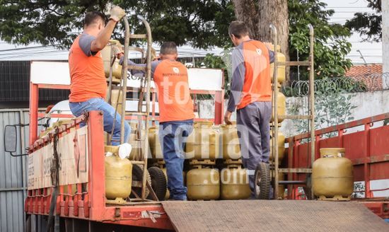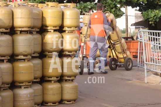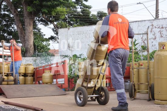 2899424 Distribuidora de gás de cozinha em Campo Mourão, na Região Centro-Oeste do Paraná. Na foto, funcionários carregam caminhões com botijões de gás de cozinha para entrega em pontos de revenda.