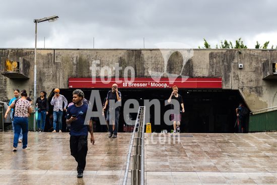 Passageiros utilizam a entrada da estação Bresser-Mooca da Linha 3-Vermelha do metrô, na cidade de São Paulo, A imagem retrata o movimento cotidiano de pessoas em um dos principais meios de transporte público da maior metrópole do país. A arquitetura brutalista da estação, caracterizada pelo uso de concreto aparente, é um marco do design de muitas estações paulistanas e serve de pano de fundo para a diversidade de cidadãos que transitam pela cidade. Esta cena é um reflexo da vida urbana, ilustrando temas como mobilidade, urbanização e o dia a dia dos trabalhadores em grandes centros urbanos, sendo ideal para abordar geografia, sociologia e estudos urbanos no Brasil.