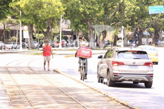2853341 Entregadores por aplicativo circulando no centro do Rio de Janeiro.