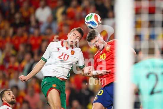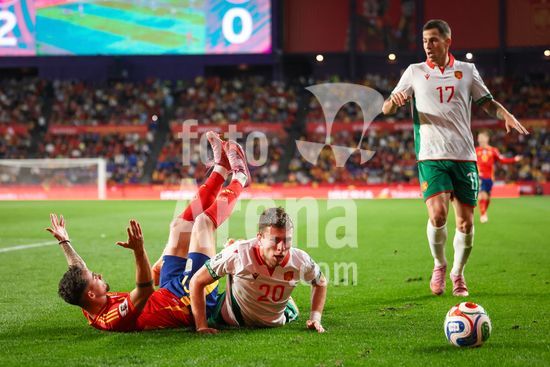 2824357 Yéremy Pino e Martin Georgiev competem por uma bola dividida durante Espanha x Bulgária realizada no Estadio José Zorrilla em Valladolid, CL, nesta terça-feira, 14.