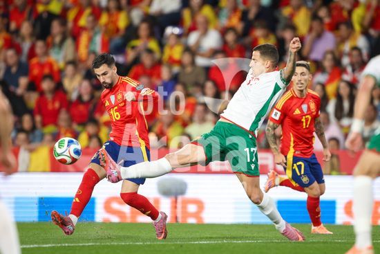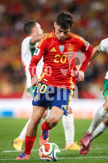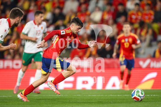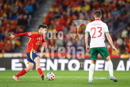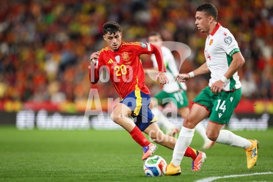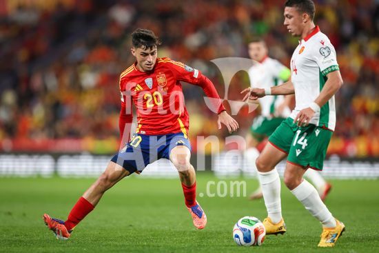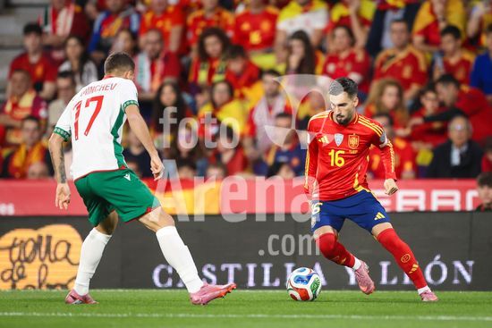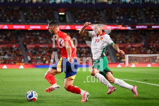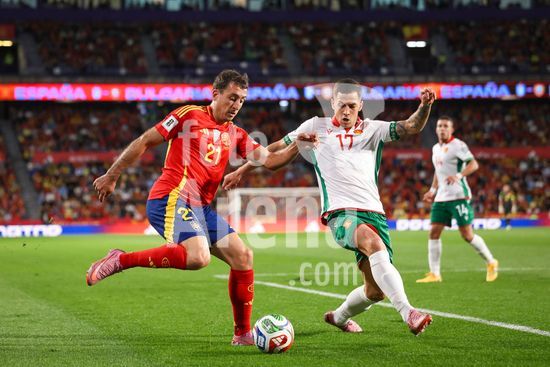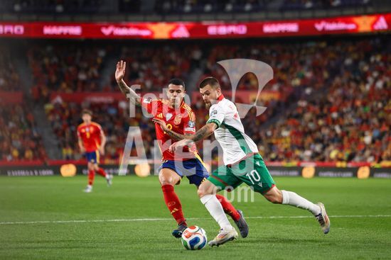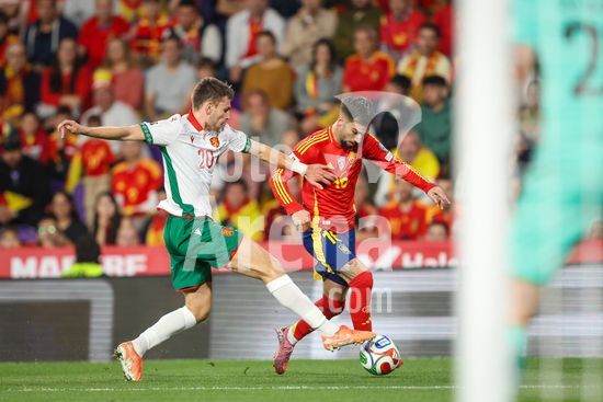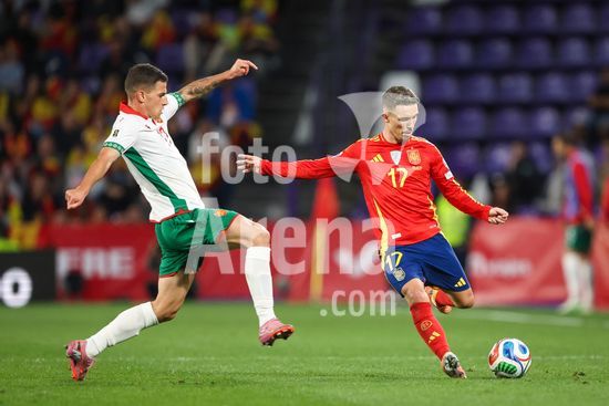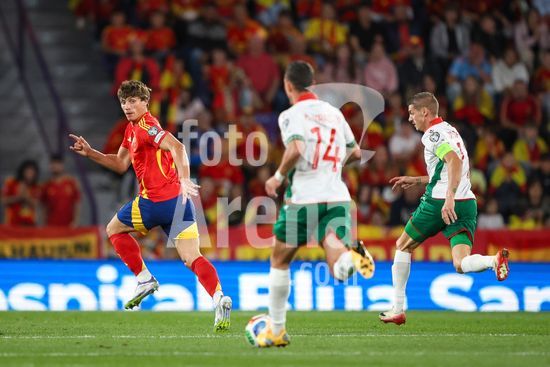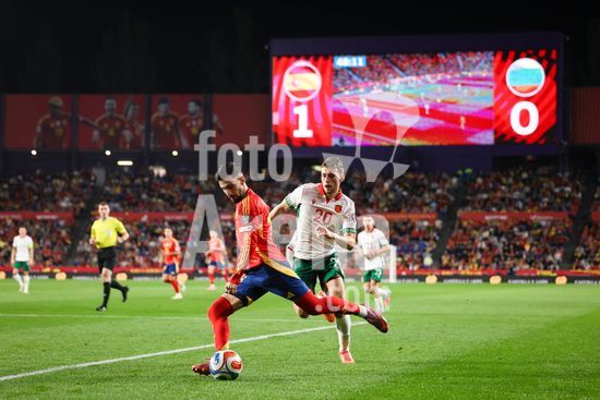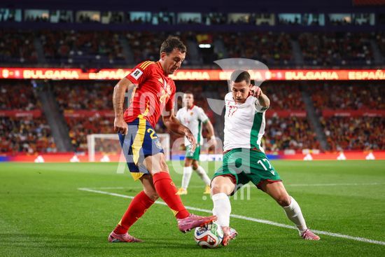 2824307 Pedro Porro em ação e Radoslav Kirilov disputam a bola durante Espanha x Bulgária realizada no Estadio José Zorrilla em Valladolid, CL, nesta terça-feira, 14.
